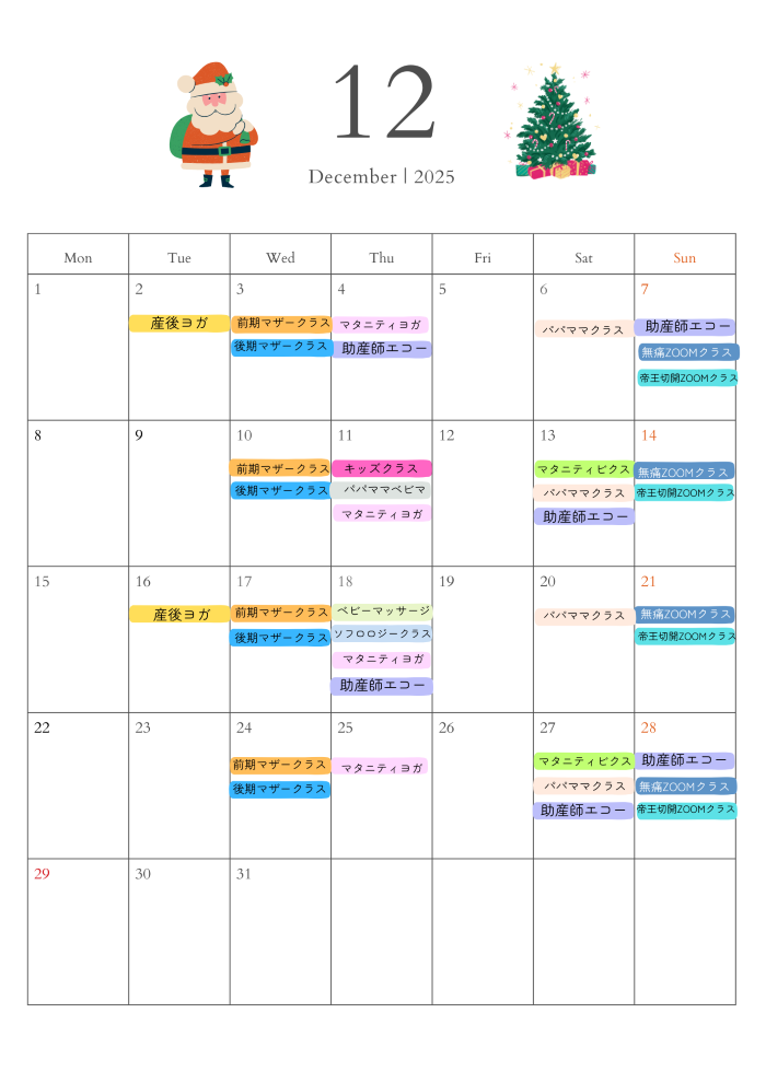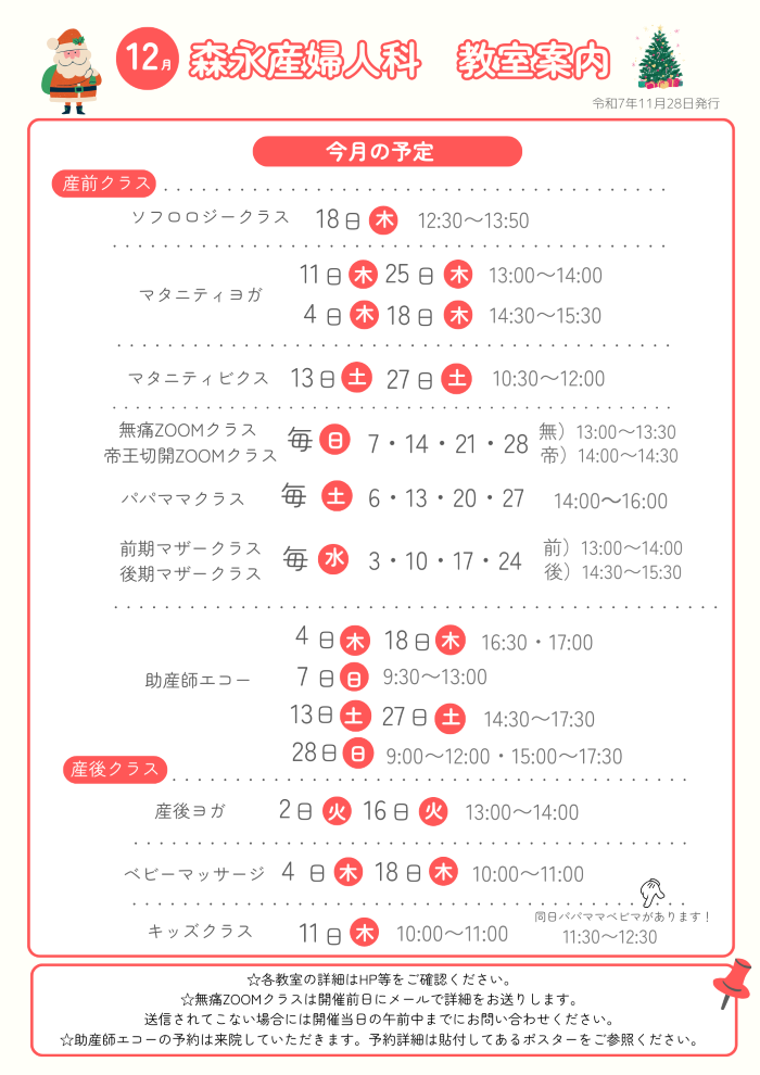 12月の産前・産後クラスの日程が出ました。