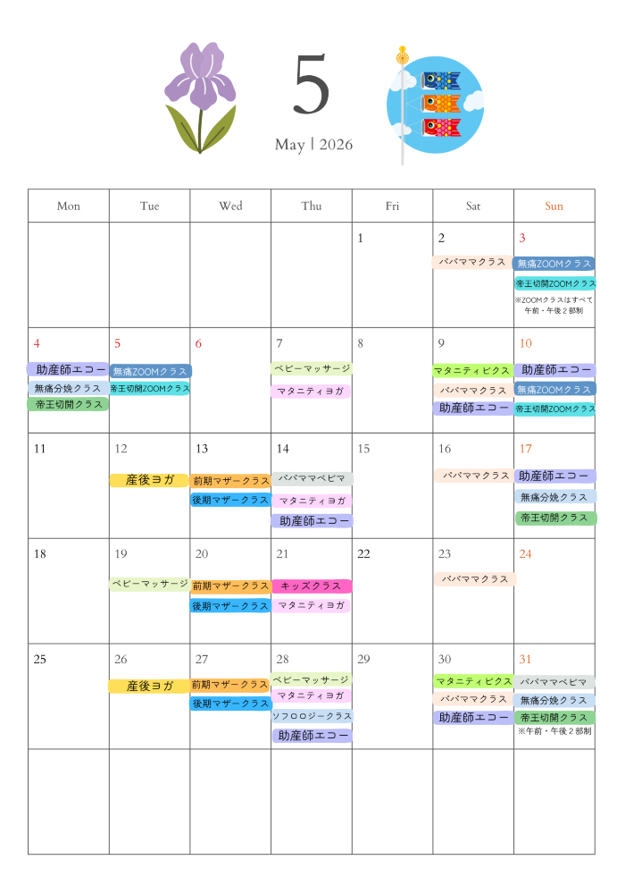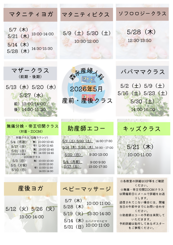 5月の産前・産後クラスの開催日時をお知らせいたします。